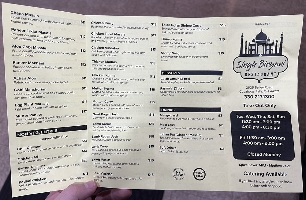 Singh Biryani, located in Cuyahoga Falls, offers a wide selection of authentic Indian dishes. Start your meal with delicious starters like Samosas, Aloo Tikki Chaat, or Paneer Pakora. Indulge in flavorful rice options like Jeera Rice or Peas Rice. Pair your meal with traditional Indian bread like Garlic Naan or Paneer Naan. Customers rave about the quality and taste of the food, with favorites like tandoori chicken and butter chicken standing out. The friendly service and quick turnaround time for orders make dining at Singh Biryani a delightful experience. Perfect for takeout or delivery, this hidden gem in Cuyahoga Falls is a must-try for Indian food enthusiasts. Don't miss out on their Happy Hour specials and vegetarian options!